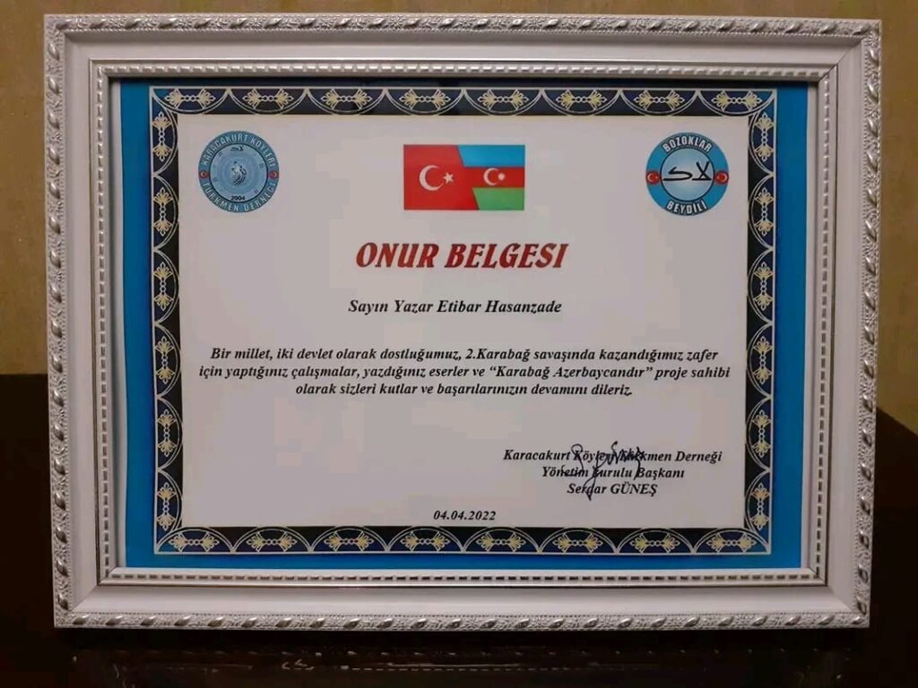 "Məni və "Qarabağ Azərbaycandır” adlı layihəmin bütün iştirakçılarını Onur Belgesi ilə mükafatlandırdığına, mənə dəyərli və anlamlı hədiyyələr göndərdiyinə görə Karacakurt Köyleri Türkmen Derneği Genel Başkanı Serdar Güneş bəyə təşəkkürümü bildirirəm. Allah ömür versin, Allah sizdən razı olsun”.